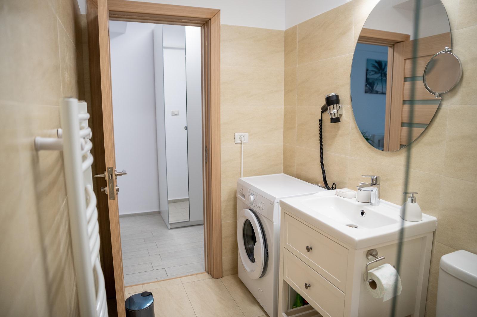 ✔️ Baie elegantă, cu finisaje premium și mașină de spălat – ideală pentru sejururi mai lungi 🚿